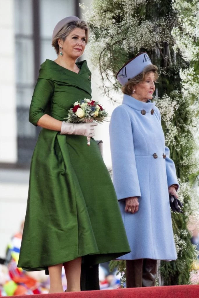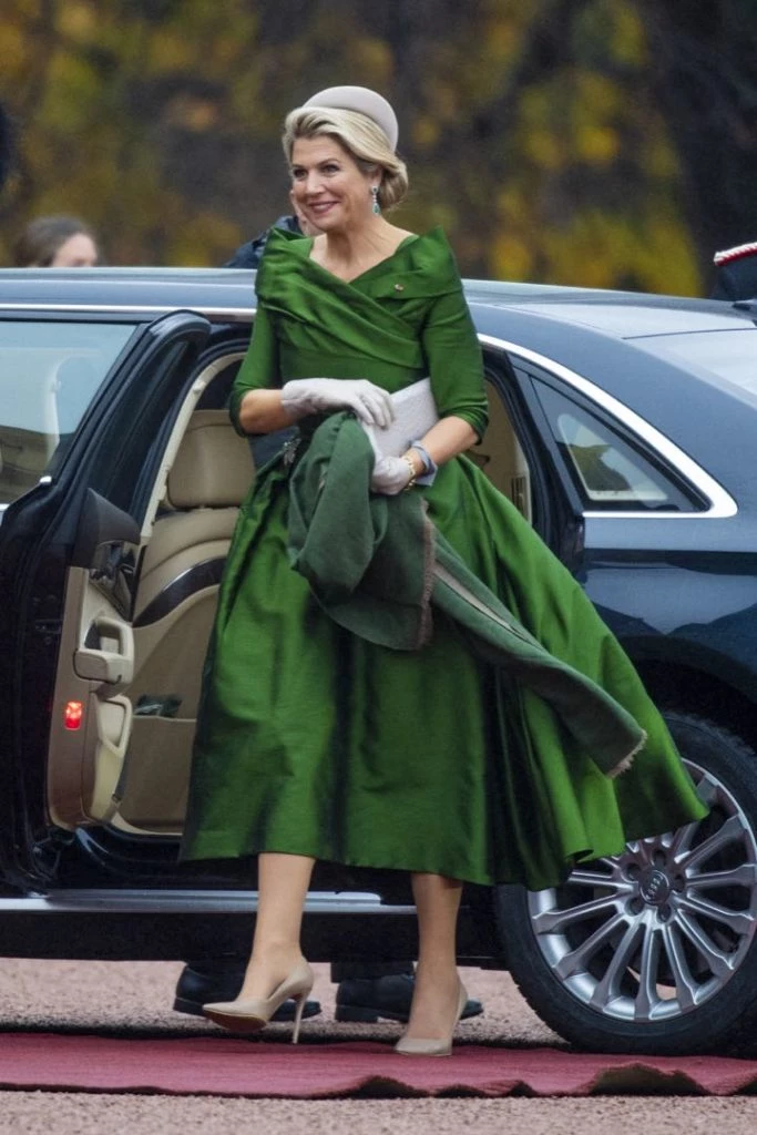 Al bajarse del auto, la reina de Holanda acaparó todas las miradas. Con un estilismo sofisticado y súper elegante, adoptó un vestido de taftán en color verde, uno de sus tonos favoritos.