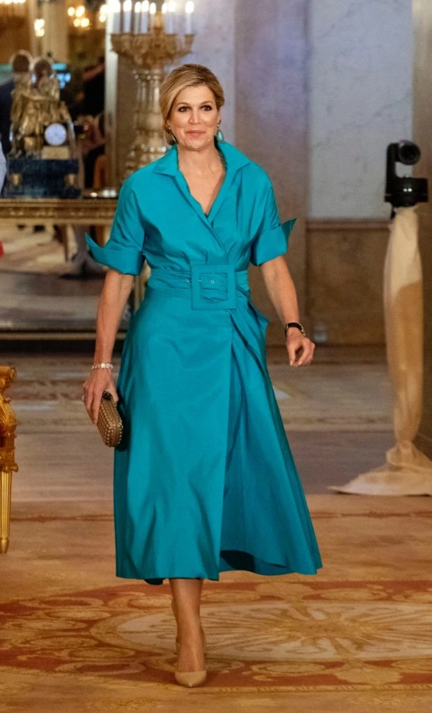 Para esta ocasión, la monarca volvió a elegir el color y lució un vestido muy años 50 de color turquesa.