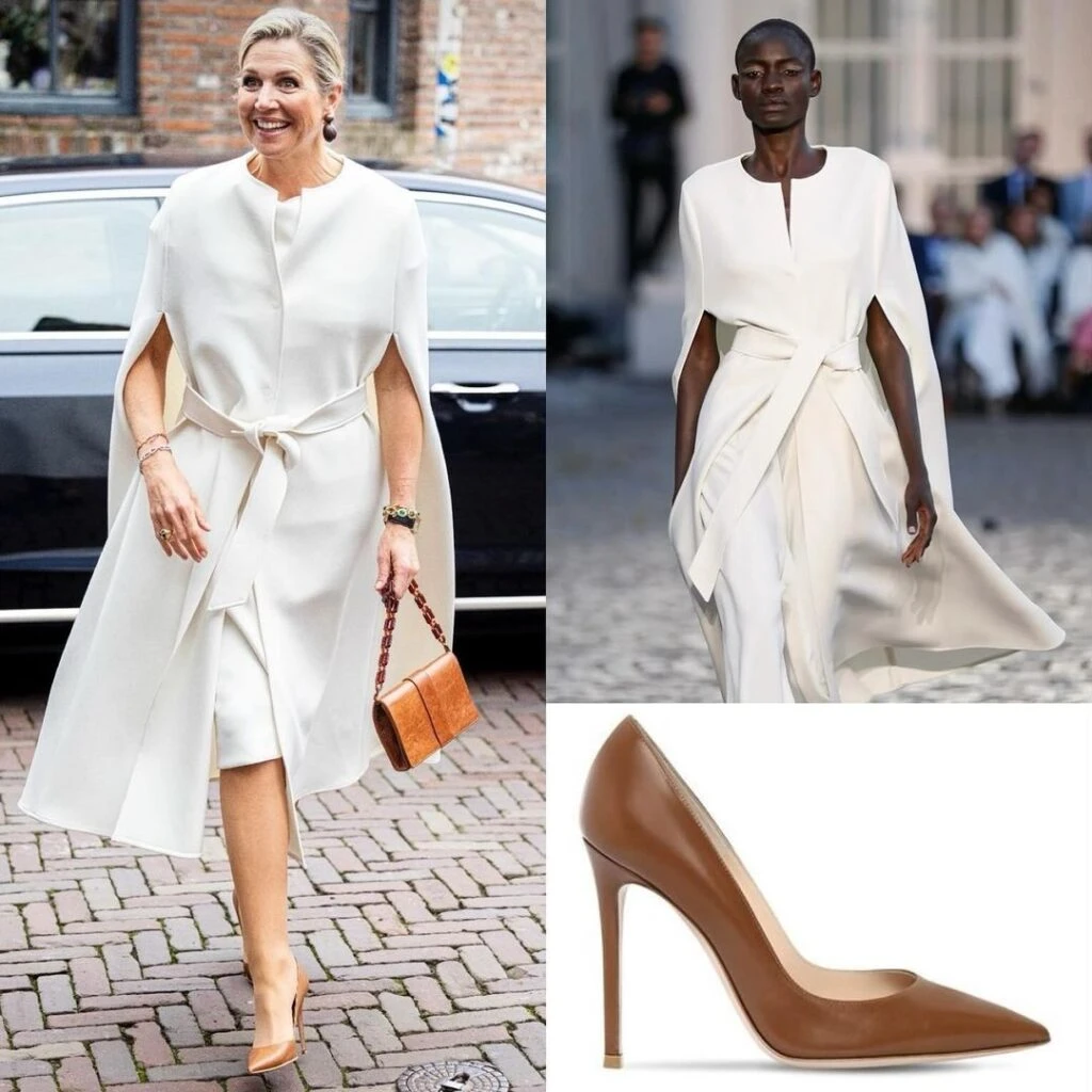 En esta ocasión, la reina de Países Bajos lució un vestido de mangas cortas de la firma Natan Couture, combinado con una capa con cinturón. A esto le sumó unos zapatos de cuero marrón de Gianvito Rossi, que ya fueron utilizados en otro evento.