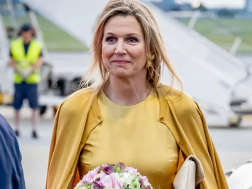 Esta pieza está confeccionada en una tela de caída suave que refleja la luz de manera delicada, resaltando los pliegues perfectamente marcados. Además, Máxima lleva un saco corto mostaza a tono, apoyado sobre los hombros al estilo “cape”, recurso elegante y moderno que refuerza su figura sin restar protagonismo al vestido.