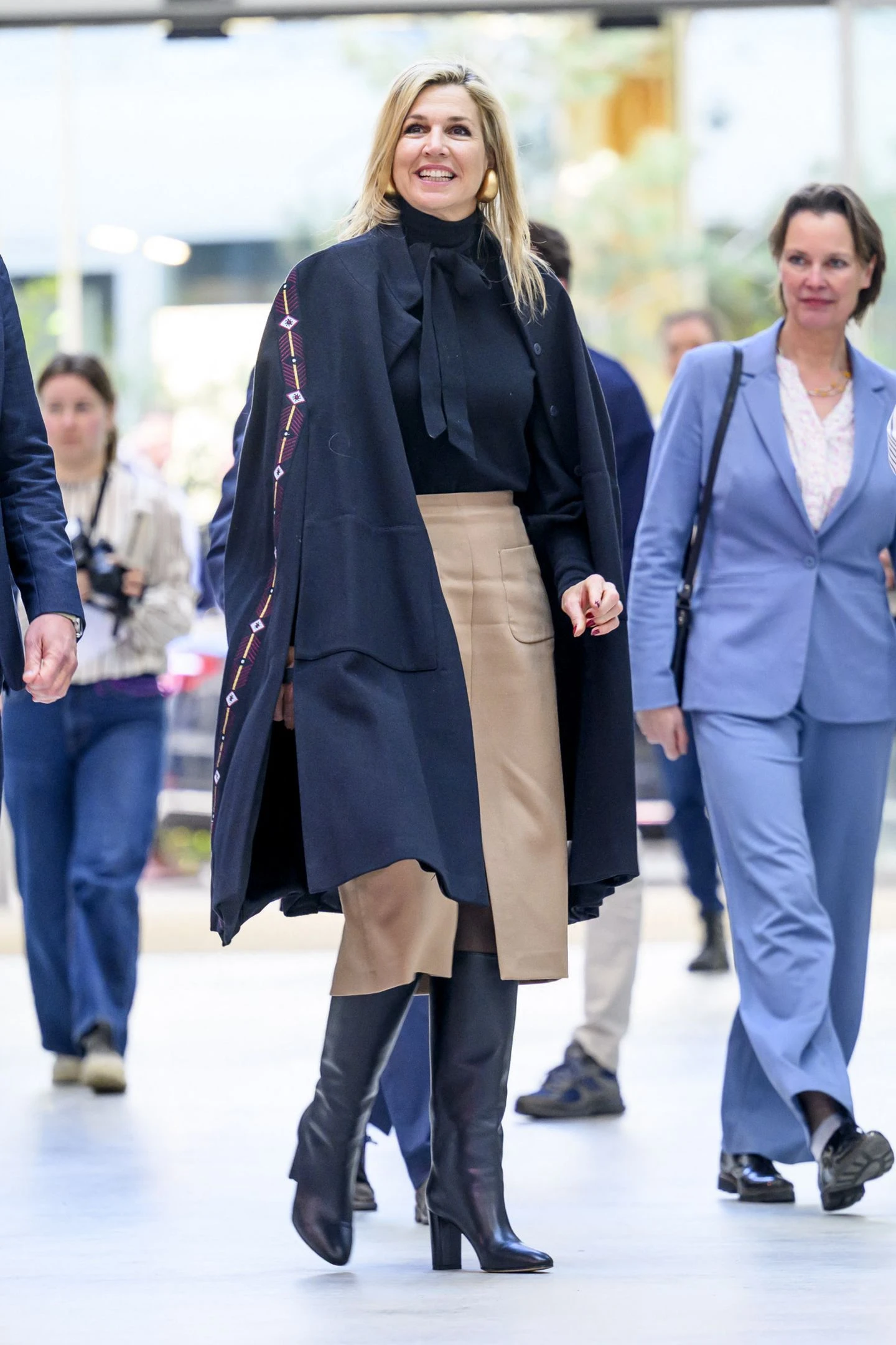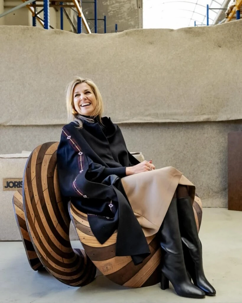 El estilismo se completó con unas botas negras largas y de taco medio, que estilizó su figura y aportó mayor presencia. Este combo (falda midi + botas alta) es uno de los más vistos del otoño europeo, y Máxima lo lleva con naturalidad, demostrando que la clave está en la proporción y la simpleza.