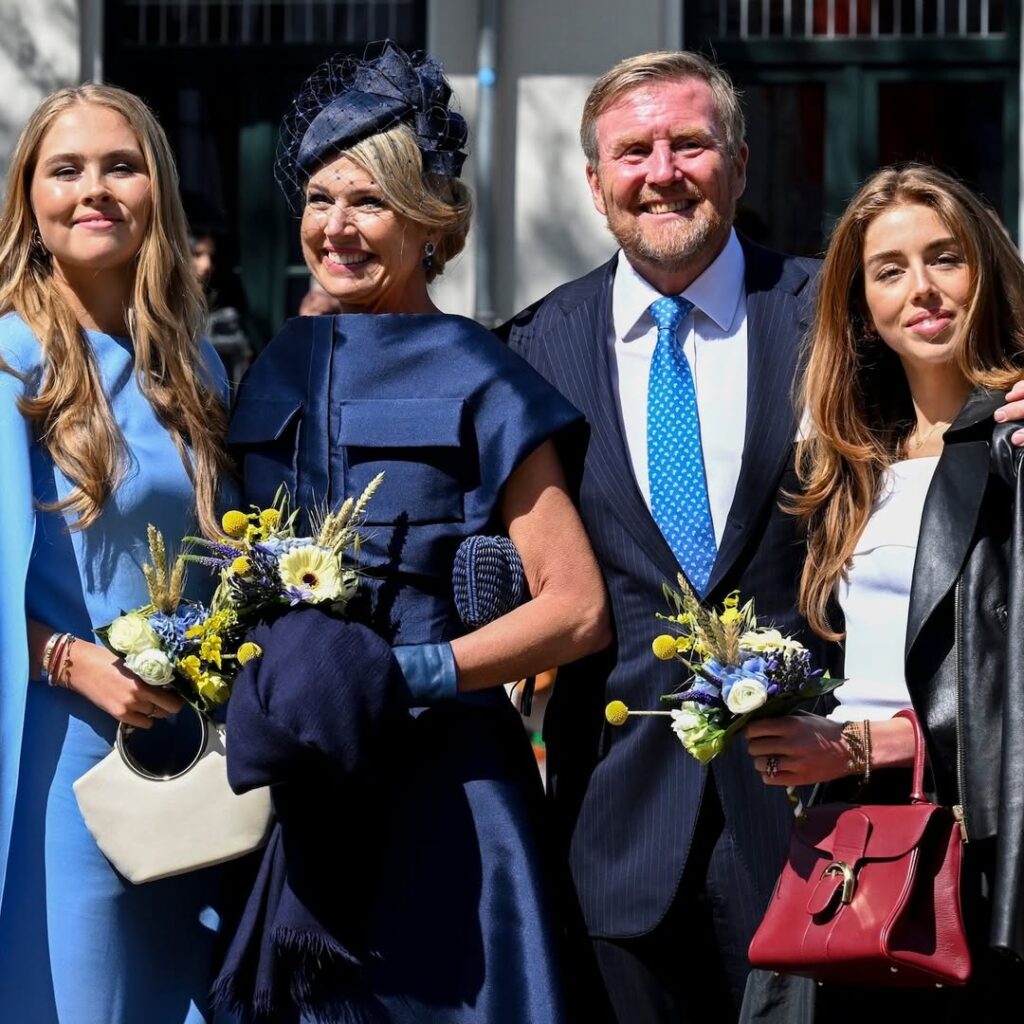 Y mientras las ciudades se visten de fiesta, con flores y globos, los reyes y sus hijas, las princesas Amalia, Alexia y Ariane suelen acompañar luciendo prendas coloridas, propias de un día de fiesta. Sin embargo, la reina Máxima eligió un outfit sobrio y muy elegante en color azul.