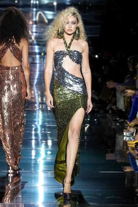 Otro de los vestidos que pueden ser usados para una fiesta en la playa fue la creación de Tom Ford, quien en su colección tuvo como pieza principal las lentejuelas y colores del mar, así como el diseño cut-out en plata y verde que Gigi Hadid llevó de manera elegante.