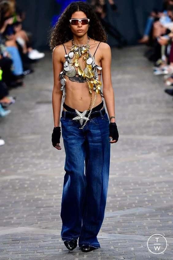 David Koma incluyó un diseño de conchas marinas entrelazadas con piezas como los jeans, las chamarras de piel, un bodysuit con transparencias y pezonera en forma de estrella marina.