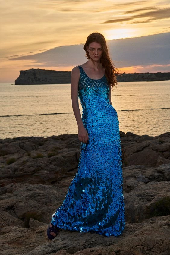 Un claro ejemplo fue el Resort 2023 de Alberta Ferretti, quien en su colección agregó prendas que tuvieron diseños referidos a las sirenas. Una de ellas fueron los vestidos tenían lentejuelas en color azul, que representaban las escamas de una sirena.