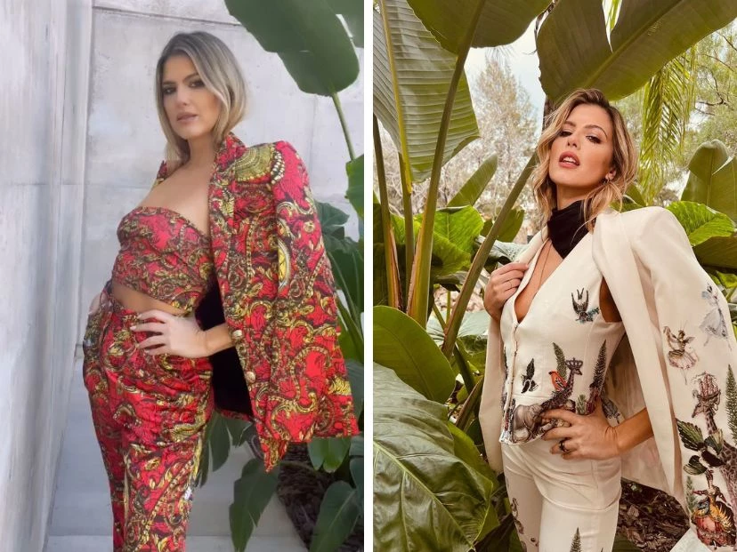 La clave es que la tela sea la misma en todas las piezas, que puede ser lisa, estampada o tramada, por ejemplo. La ex Casi Ángeles lució uno con estampas en amarillo y dorado sobre fondo rojo. El otro, en color crema, con coloridas figuras botánicas, hadas y animales.