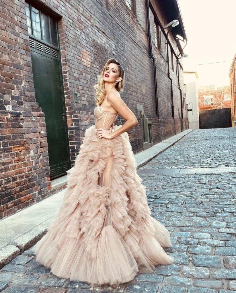 Actualmente este tipo de diseño usa en diseños de fiesta, como es el caso del que llevó Mery del Cerro: la parte superior bien entallada y una falda bien voluminosa, con pliegues y frunces de tul, en un total nude look.