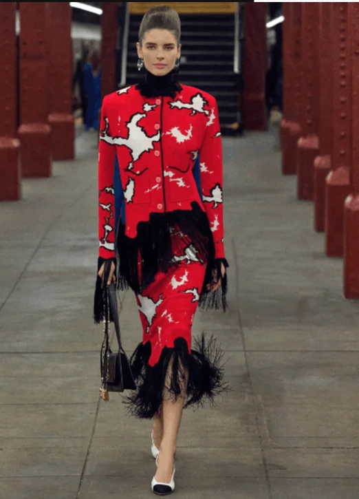 Meryl eligió un conjunto de la colección Métiers d’art 2026 de Chanel compuesto por una chaqueta y falda a juego en tejido knit, con una paleta vibrante que mezcla rojo, blanco, azul y negro.