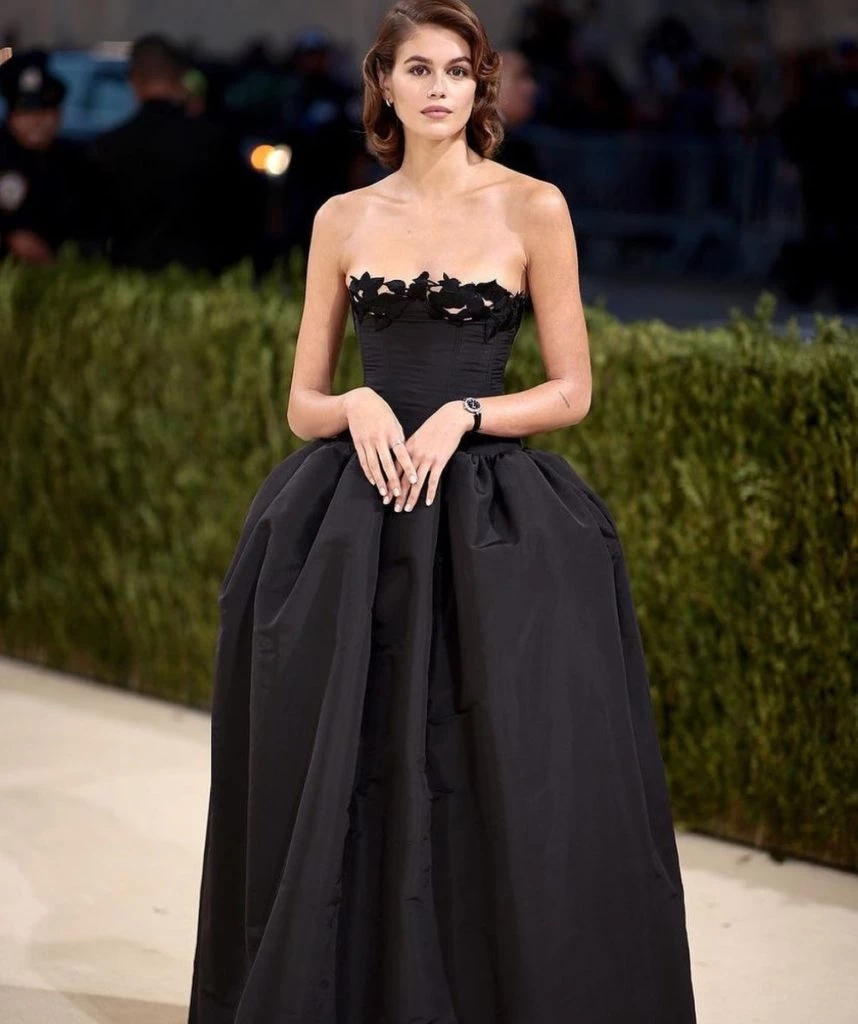 Kaia Gerber asistió por primera vez al Met Gala y para ello decidió vestirse con una elegante vestido negro inspirado en el look Halston de Bianca Jagger de la Met Gala de 1981.