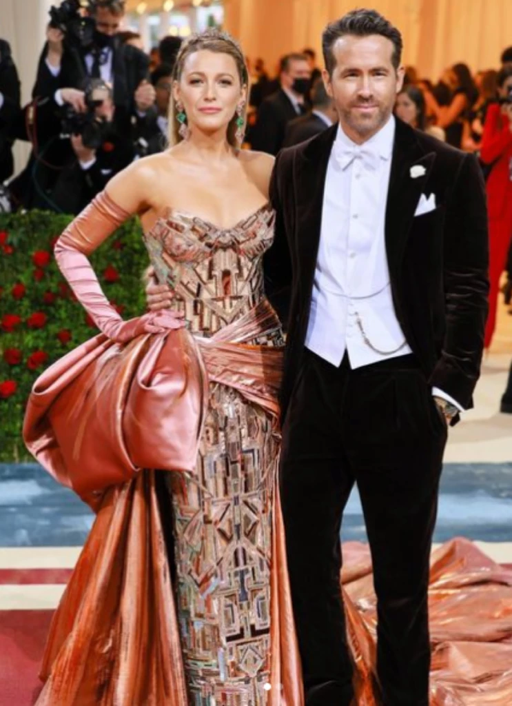 El matrimonio de actores Blake Lively y Ryan Reynolds, dos de los anfitriones de la velada propusieron su particular revisión del dress code de la noche Gilded Glamour.
