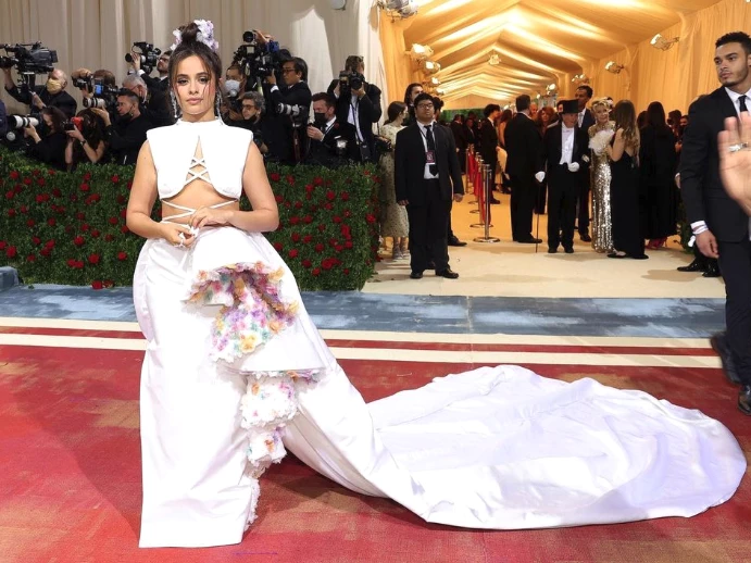 Camila Cabello usó un conjunto blanco de dos piezas con crop top que se ataba en el pecho y la cintura y una mega falda con volados con flores y gran cola. "Para mí era importante vestir algo sostenible y reciclable", mencionó la cantante sobre su elección del look para el Met Gala.