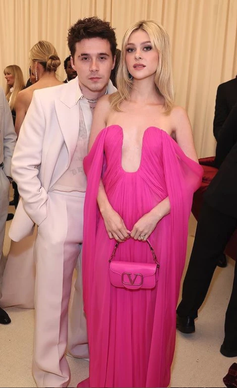 Los recién casados, Brooklyn Beckham y Nicola Peltz deslumbraron en la Met Gala con su inconfundible elegancia. La modelo y actriz llevó un vestido fucsia, el color del momento, con escote pronunciado, silueta liviana y stilettos con plataforma a juego, todo de Valentino.