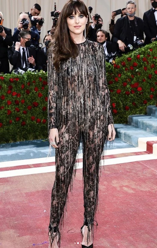 Vestida con un diseño de Gucci, Dakota Johnson llegó a la red carpet con una espectacular capa de terciopelo XL que dejaba entrever lo que más tarde descubriríamos: un mono de encaje transparente todo bordado que se ajustaba como una segunda piel.