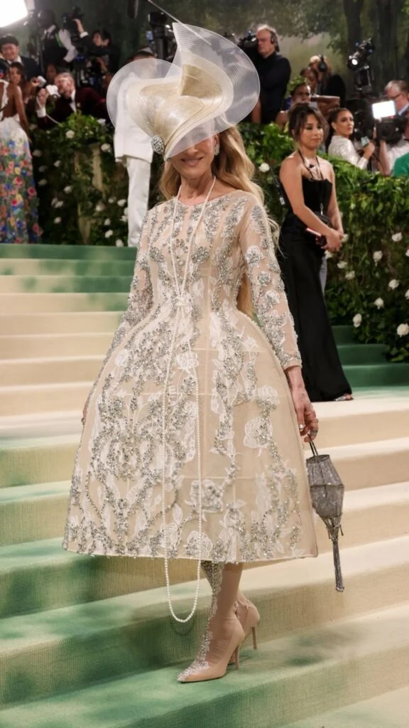 Una de las que deslumbró con su look fue Sarah Jessica Parker, quien volvió a consagrarse como "la reina de los tocados". En esta oportunidad, la reconocida actriz lució un vestido nude en forma "acampanada" con aplicaciones de joyas de Richard Quinn y además, llevó un tocado diseñado por Philip Treacy.