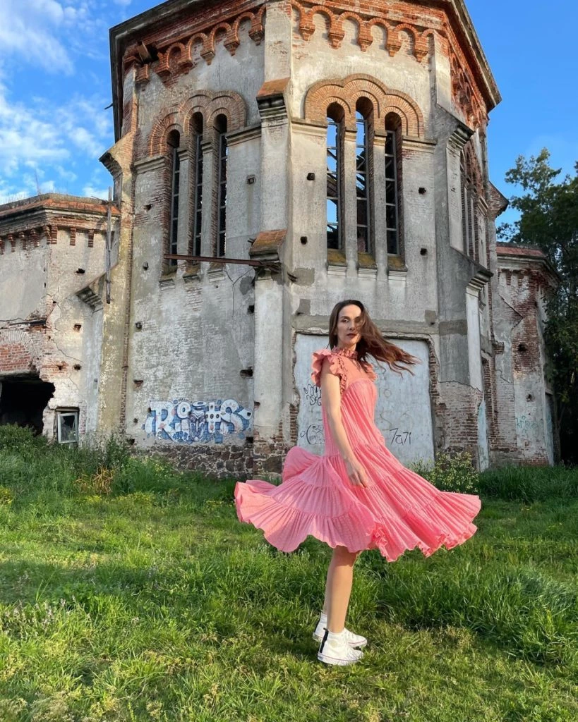 La cantante eligió un vestido plisado sin mangas de impronta romántica, un diseño con largo midi y volados en cuello y mangas. Como remate lo combinó con unas zapatillas botitas blancas para darle un aire más juvenil y actual.