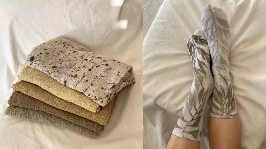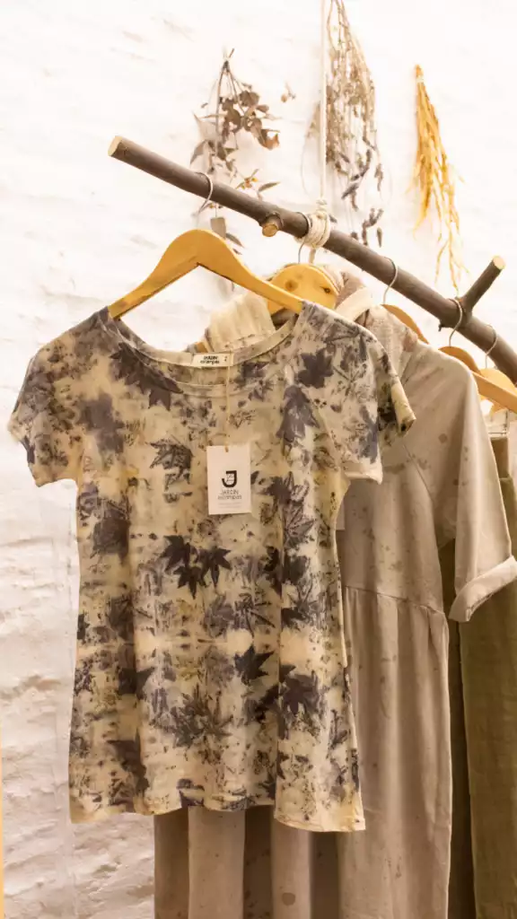 Para diseñar cada una de las prendas de Jardín Estampas, Zoia se inspira en el trabajo de las culturas originarias y en los oficios manuales. Además de las telas que emplea, interviene los productos de su tienda con elementos ofrecidos por la naturaleza: desde hojas, hasta flores y cortezas, con las cuáles arma los estampados y teñidos de las prendas.