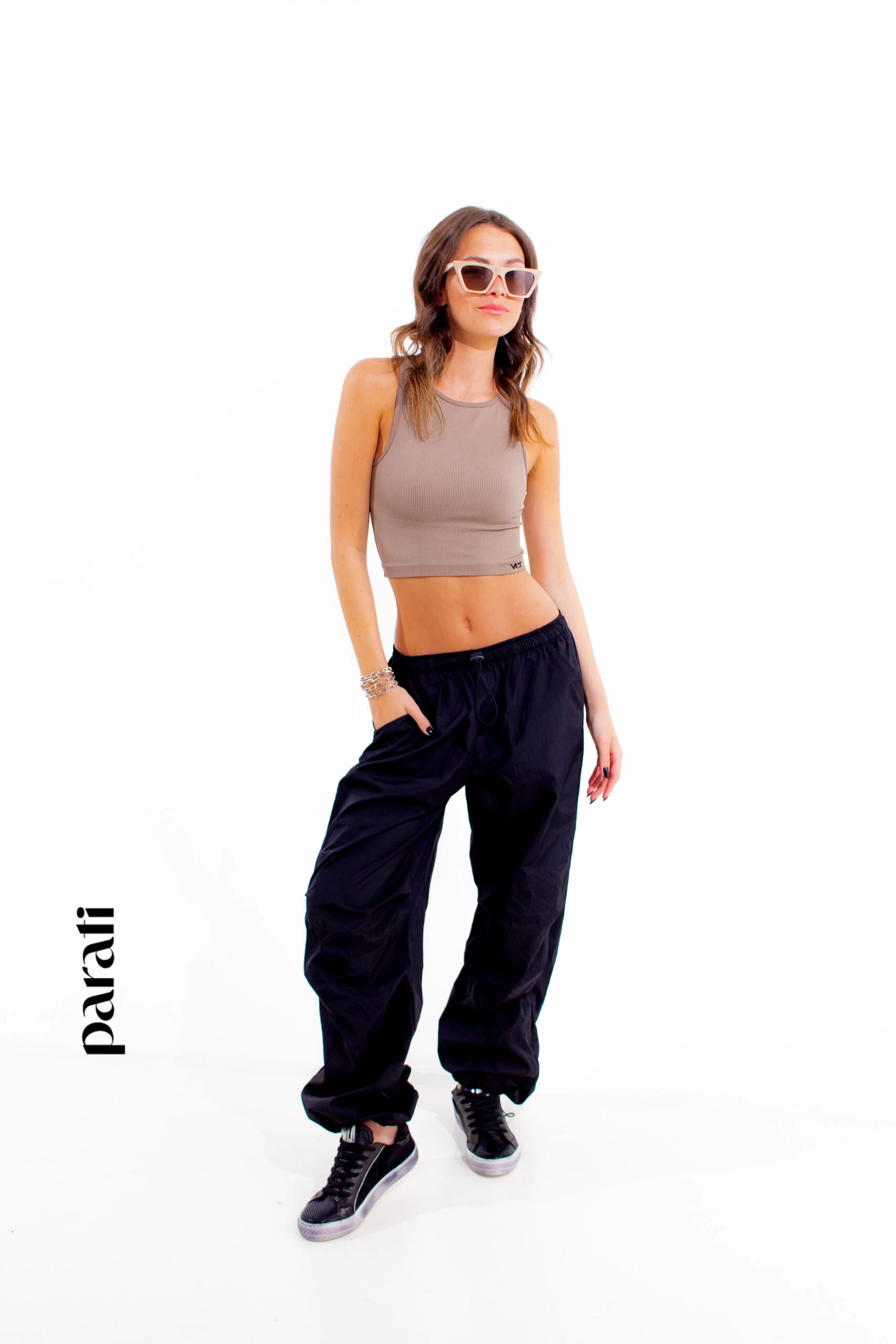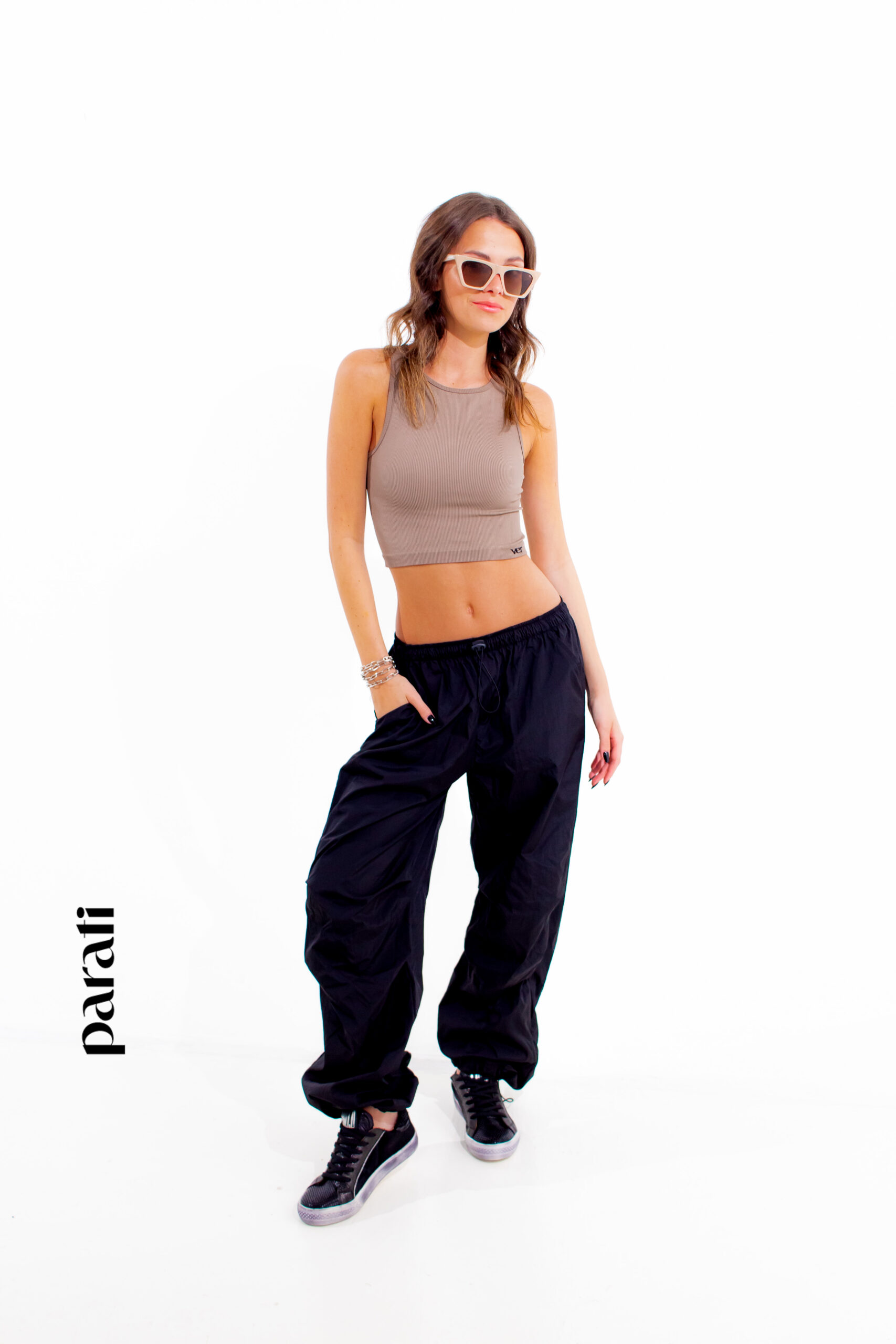 Dónde conseguirlo: Top de rib y pantalón parachute (Ver, @verapasionadas) zapatillas de cuero (Puli D. Shoes, @pulidshoes), anteojos de sol (Hardem, @hardem_official) y pulsera con cadena (Isadora, @isadorastyle).