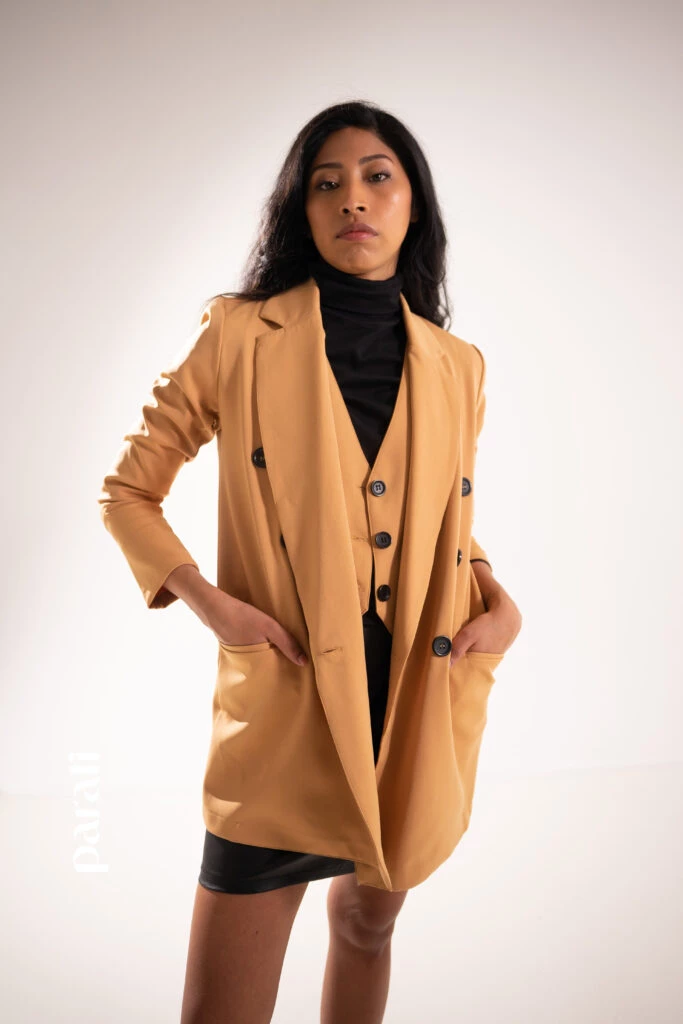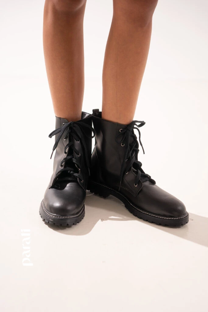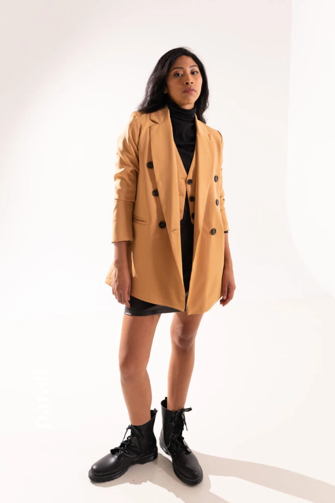 Dónde conseguirlo: Blazer, chaleco, polera de algodón y falda de cuero ecológico (Peuque, @peuquejeans) y borcegos (Renner, @renner_ar).