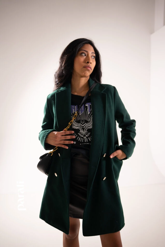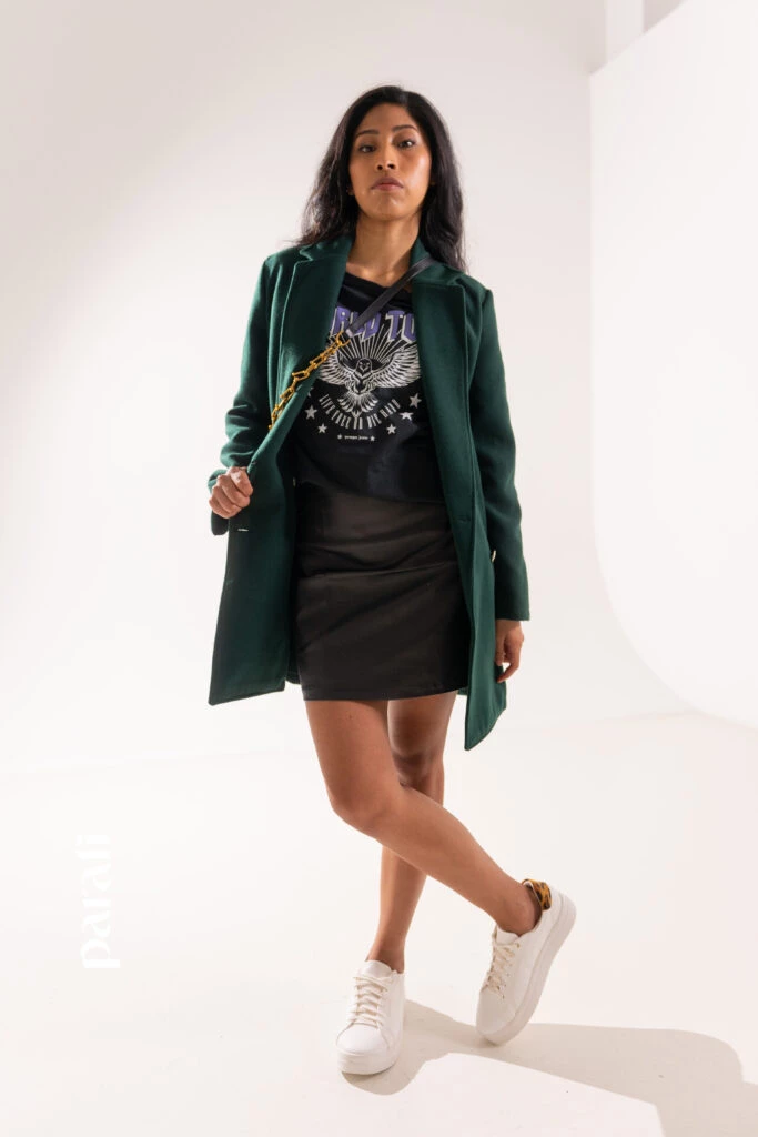 Dónde conseguirlo: Tapado de paño, remera de algodón y falda de cuero ecológico (Peuque, @peuquejeans), cartera con cadena y zapatillas (Renner, @renner_ar).