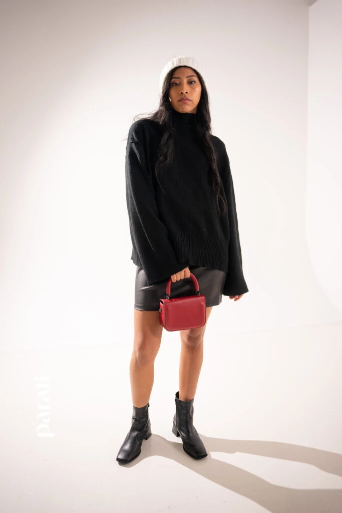 Dónde conseguirlo: Suéter con mangas amplias (Furzai, @soyfurzai), falda de cuero ecológico (Peuque, @peuquejeans), mini bag con solapa y botas de cuero ecológico (Renner, @renner_ar).