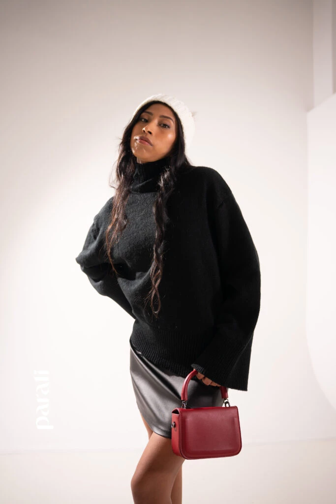 Para una salida nocturna, enfrentá el frío con una polera Xl y un gorro tejido. Sumale una cartera de color para darle el toque cool al look.