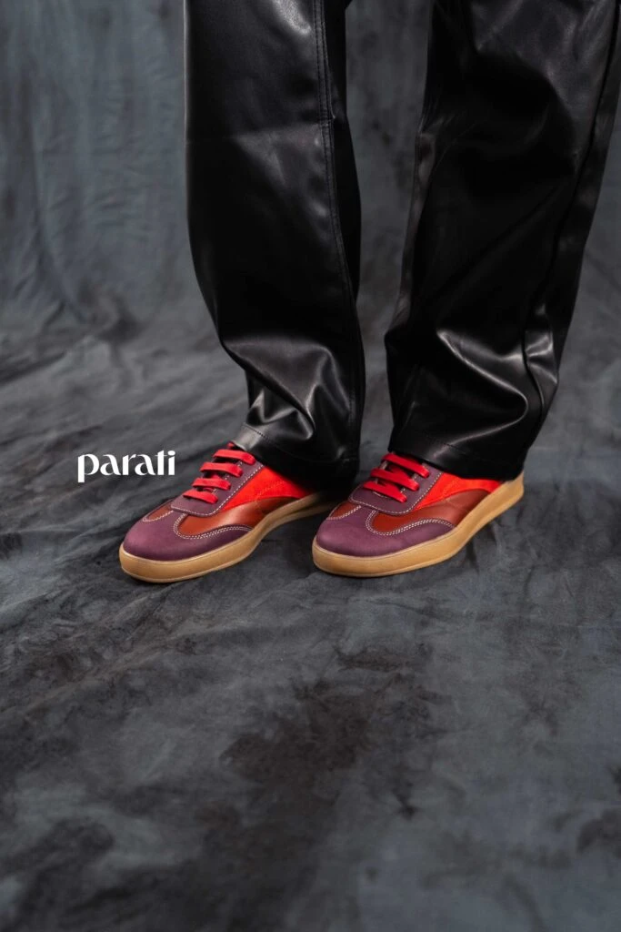 Blazer con textura (Vintage Reciclado, @vintagereciclado), camisa de poplín y pantalón de cuero ecológico (Böön, @boon.oficial), zapatillas combinadas de cuero y gamuza (Fiskyn, @fiskynzapatos) y aros con strass (Todomoda, @todomodaoficial).