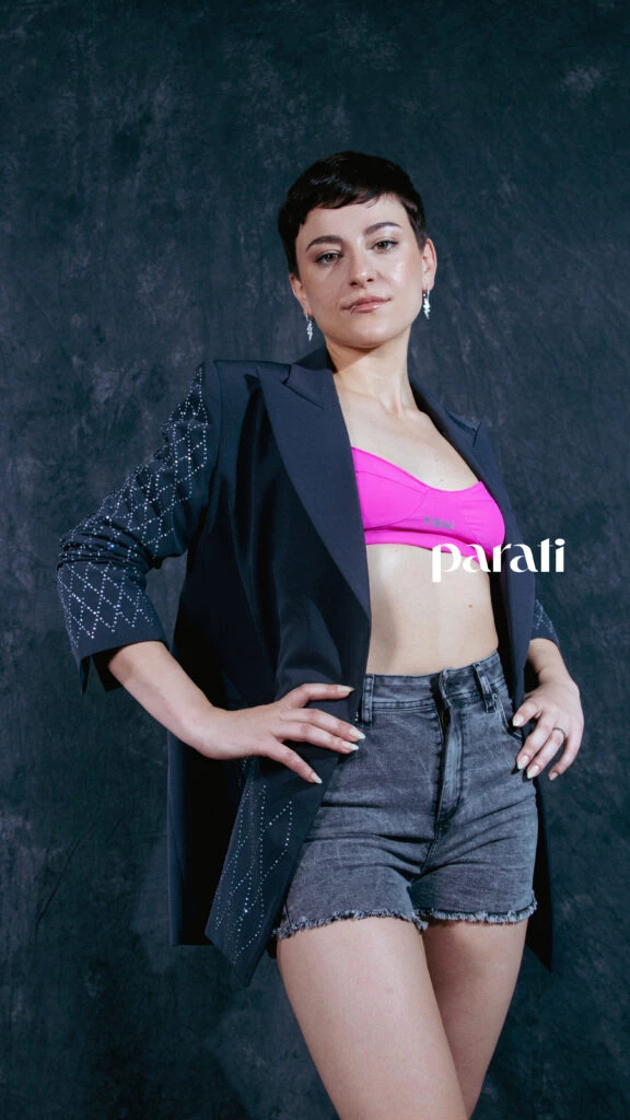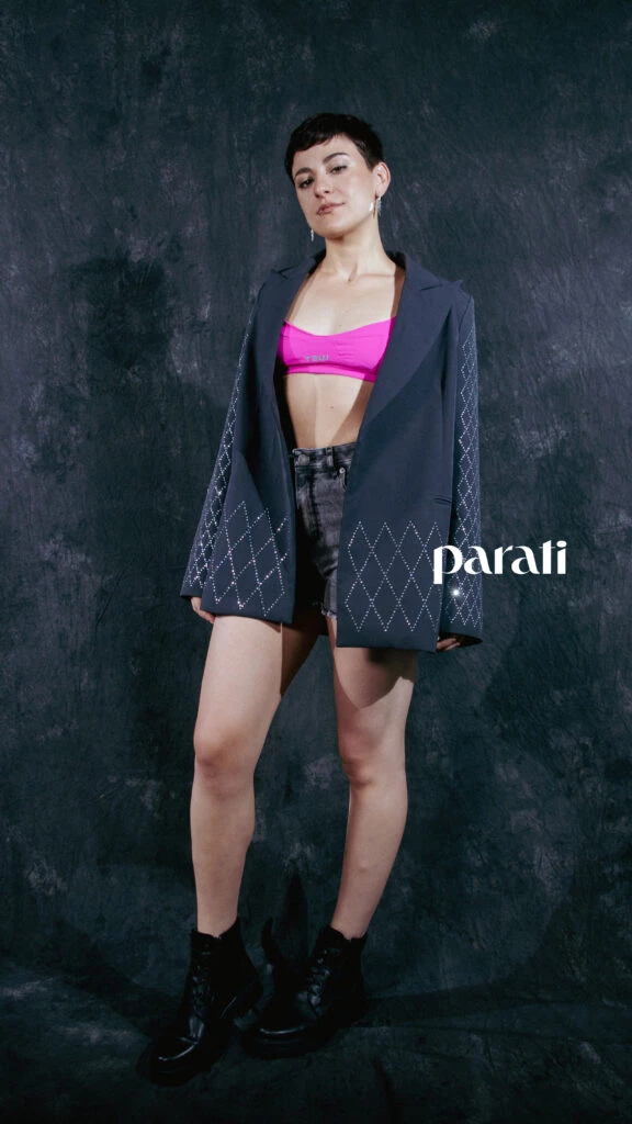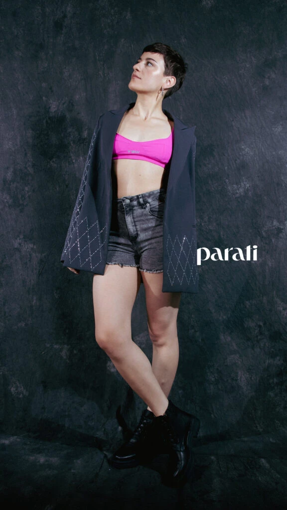 Dónde conseguirlo: Blazer con brillos y crop top elastizado (The Ann Wagners, @theannwagners), short de denim (Swa-mi, @swamioficial), borceguíes de cuero (Oggi, @oggizapatos) y aros (Carla De Luca, @carladeluca.store).