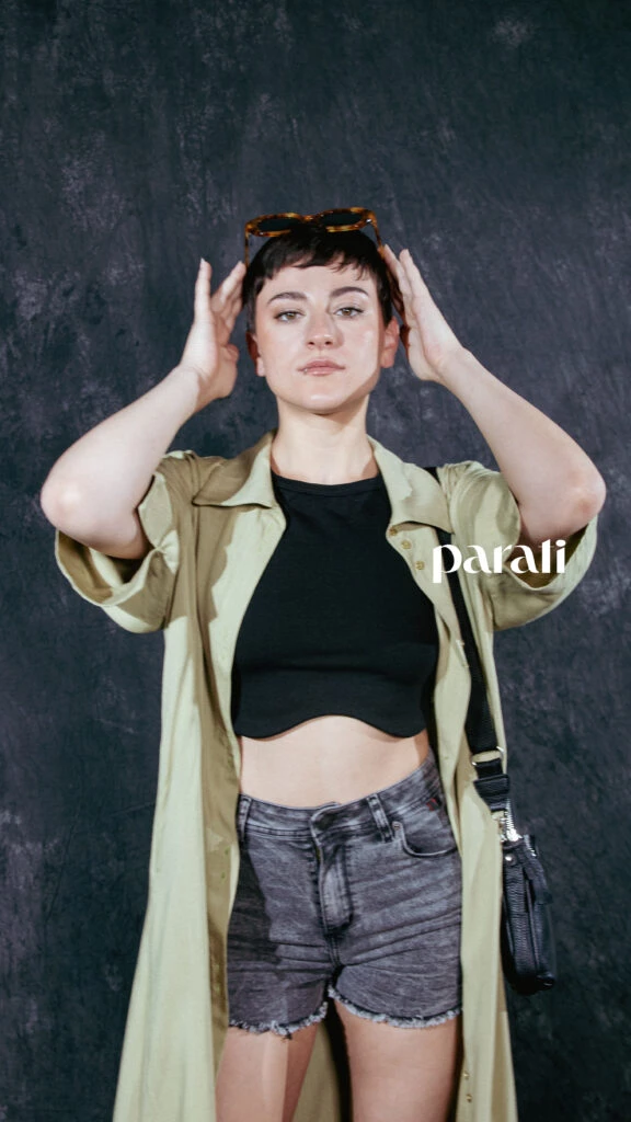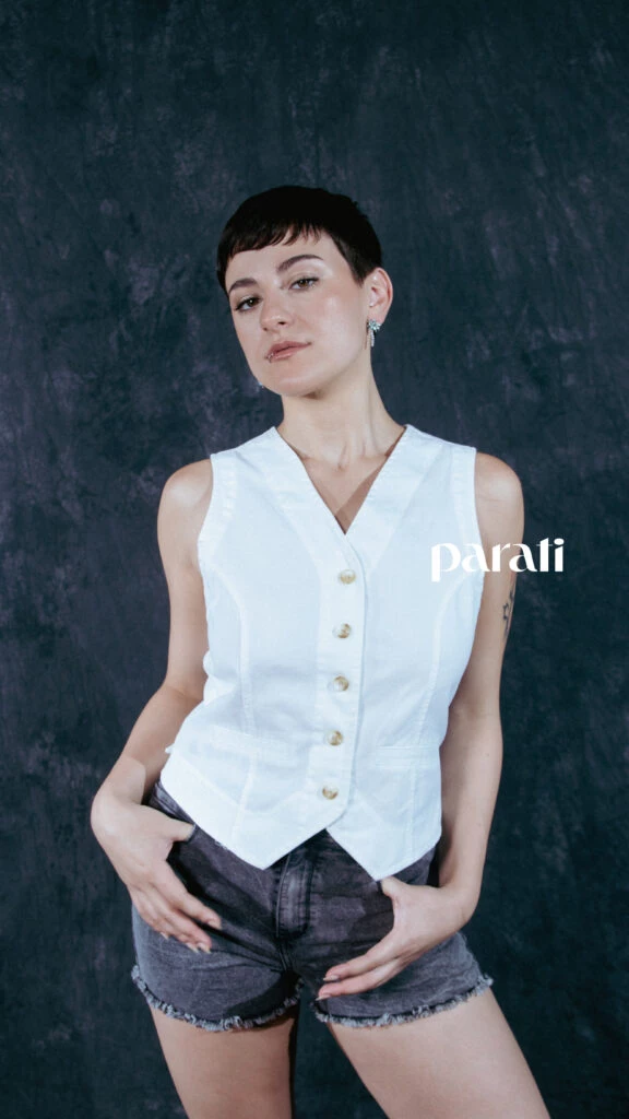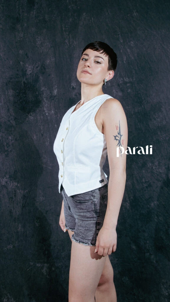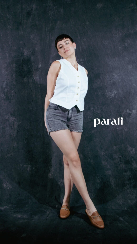 Dónde conseguirlo: Chaleco de gabardina y short de denim (Swa-mi, @swamioficial), slippers de cuero (Oggi, @oggizapatos) y aros (Carla De Luca, @carladeluca.store).