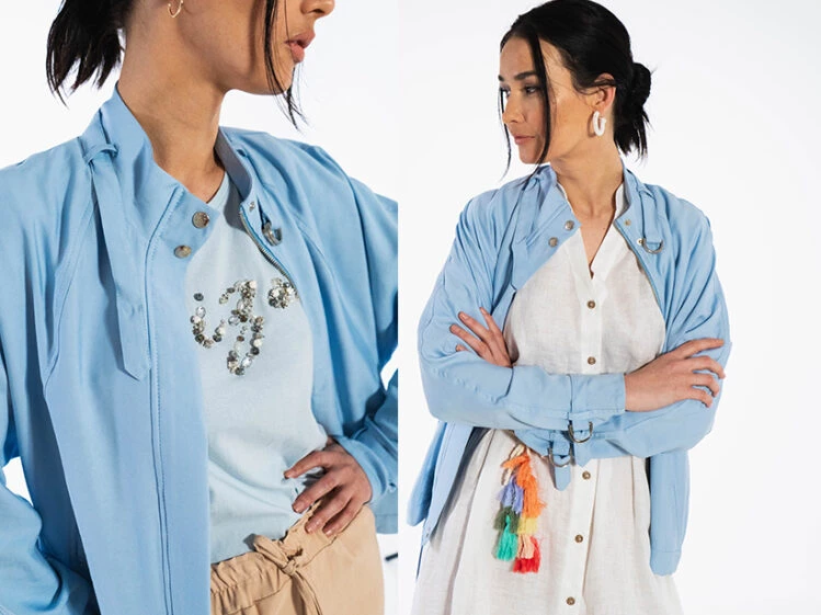 Dónde conseguirlo: Campera bomber y vestido de lino con lazo (Mirta Armesto, @mirtaarmestook), sandalias de gamuza (Dera Shoes, @derashoes.ar) y aros redondos (Ver, @verapasionadas).