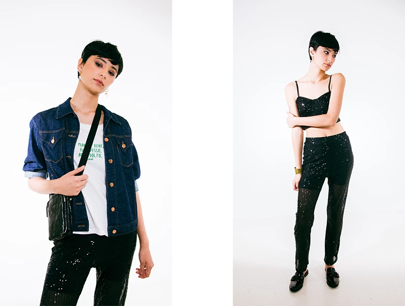 Dónde conseguirlo: Campera de denim y remera de algodón con bordado (Swa-mi, @swamioficial), pantalón con brillos (Peuque, @peuquejeans), aros con piedras (Mola Accesorios, @mola_bsas) y bandolera de cuero acharolado y zapatillas de cuero (Oggi, @oggizapatos).
