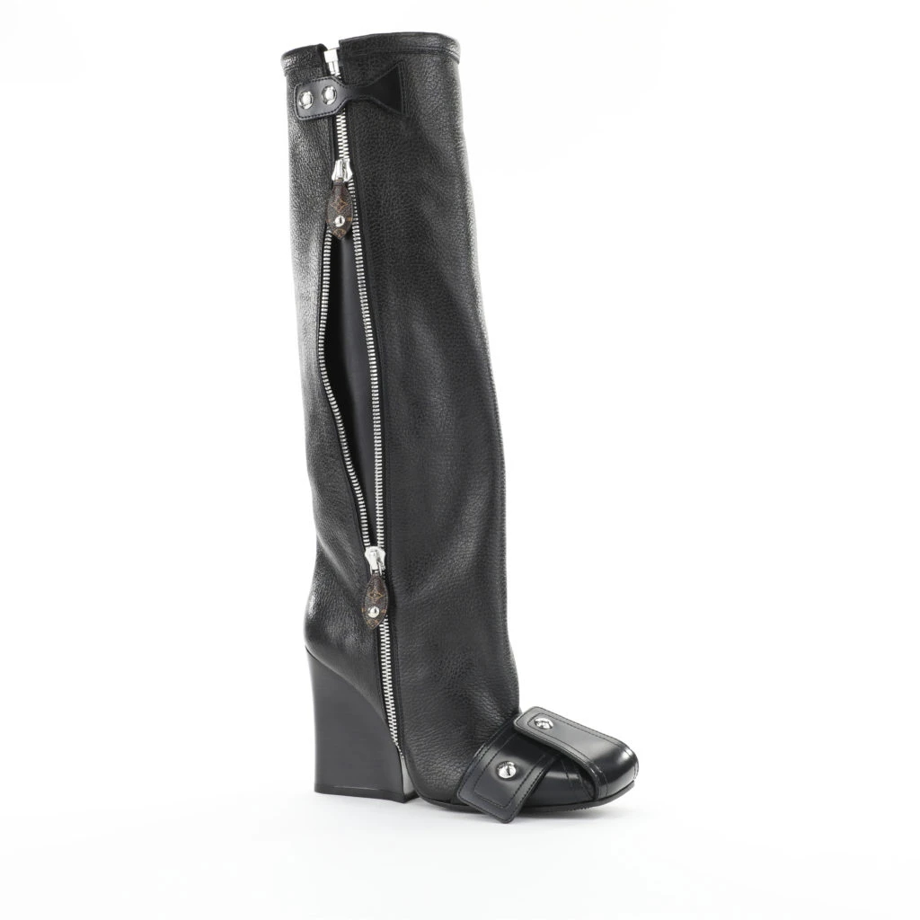 La pieza clave de la colección Otoño-Invierno 2021 es la bota Patti inspirada en la chaqueta de motociclista, con cremallera bidireccional, tachuelas metálicas grabadas en Louis Vuitton y correas dobladas en la puntera. Disponible como botín o en una versión más larga, viene en una selección de negro o en una gama de combinaciones de colores llamativos. Con un toque punk y chic, esta bota de cuña llamativa es un estilo inconfundiblemente vanguardista.