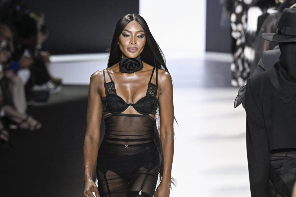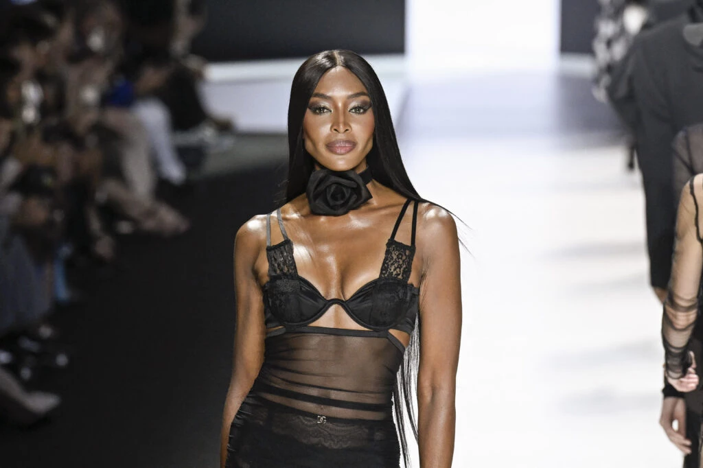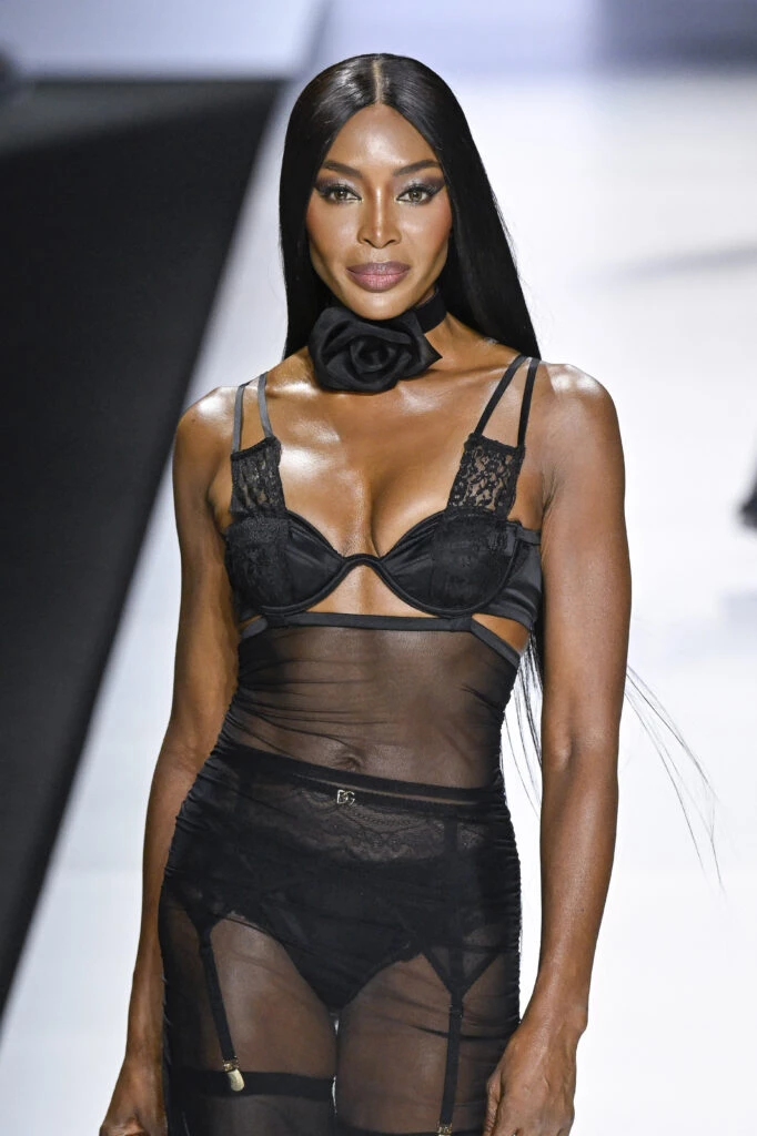Naomi, de 53 años, desfiló vistiendo un espectacular diseño en negro, el color más elegido por los diseñadores, con importantes transparencias y corsetería a la vista.