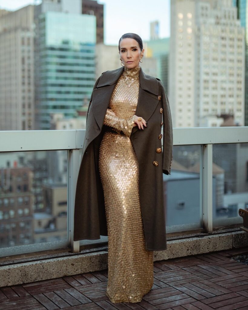 La actriz uruguaya llevó un vestido largo en tono Old Gold, realizado en tul francés bordado artesanalmente en cristales checoslovacos y lentejuelas opacas.