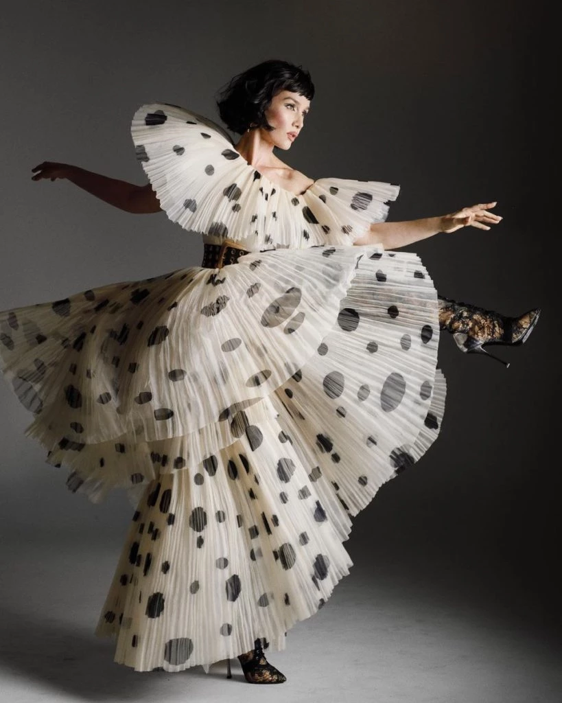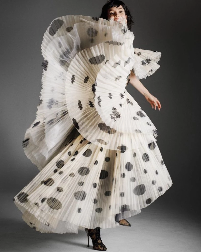 Para la gala final, la actriz y cantante lució un espectacular vestido todo plisado en blanco con grandes lunares de color negro.