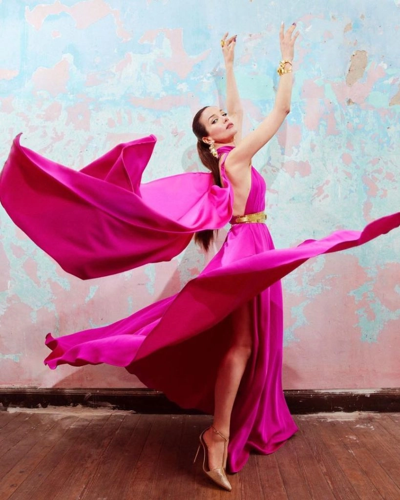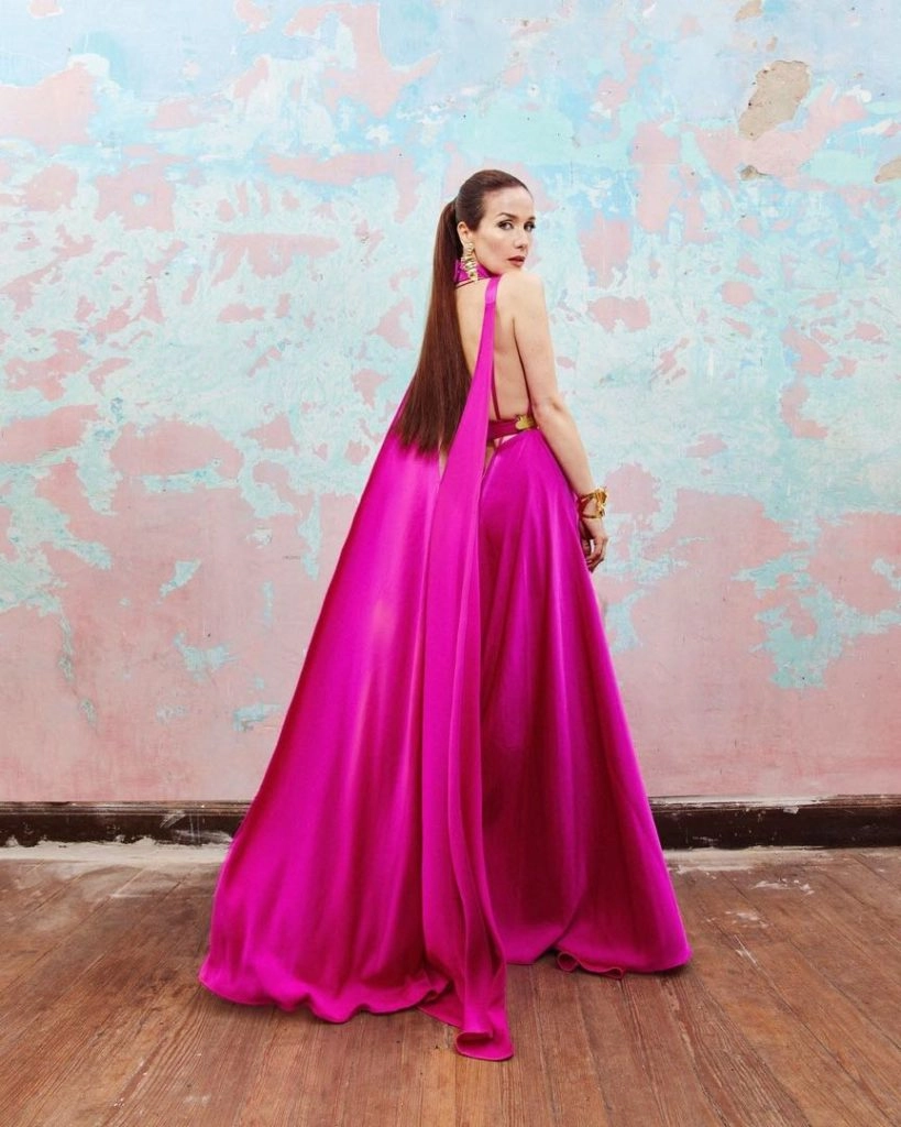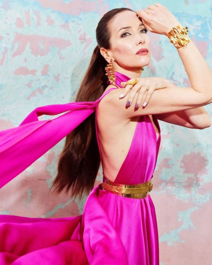 El tono fucsia se complementó con detalles y bijou en dorado, que hacían parecer a la uruguaya una princesa del Medio Oriente: aros, brazalete, anillos y un cinturón.