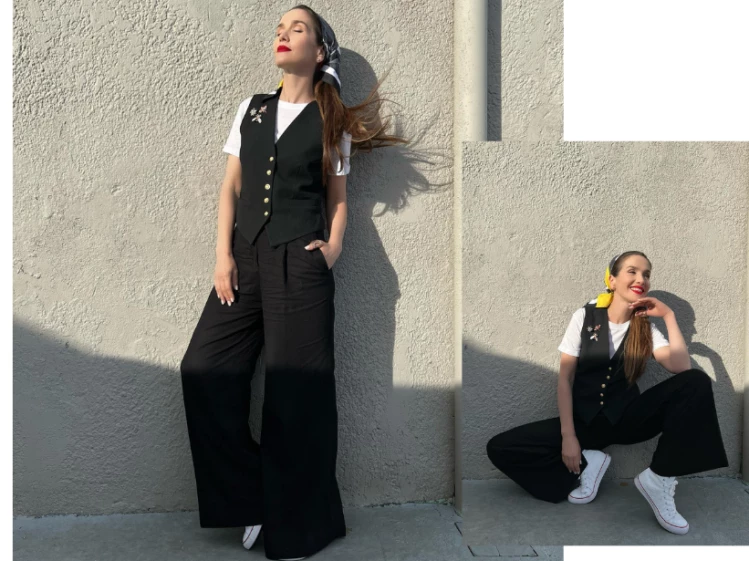 Su particular look nos muestra cómo se lleva la sastrería en verano, combina un exclusivo palazzo y una chaqueta con apliques dorados, haciendo juego.