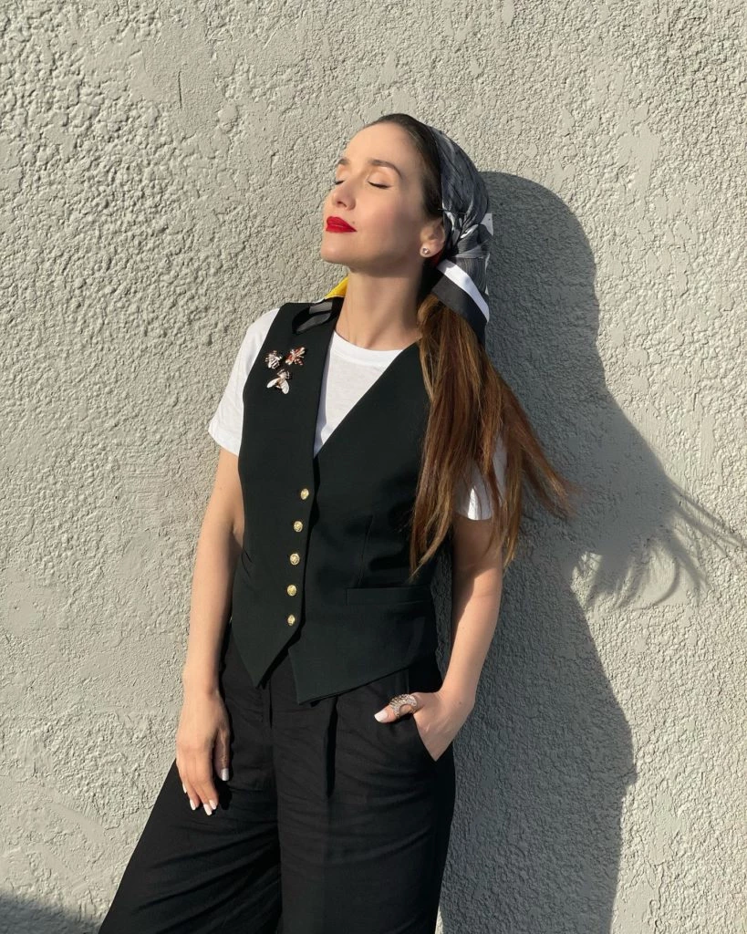El tip de color: Lo aplicó con un bellísimo pañuelo de raso en su cabeza, que juega con las texturas y los colores, amarillo, blanco, gris y negro.