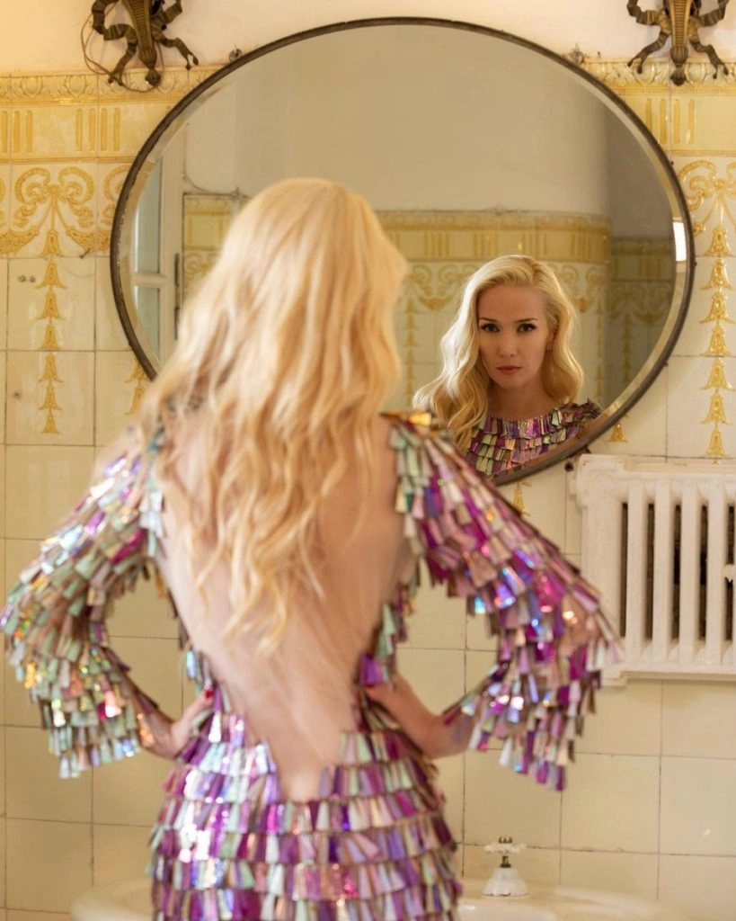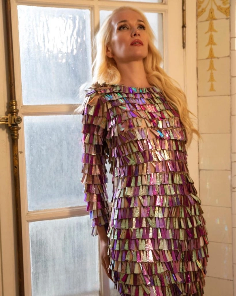 "Buen día, así de sencillita me vine a lavar los dientes!… Qué locura de vestidito. ¿Saben cómo está hecho? ¡Reciclando! CDress es una pieza diseñada por Agustín Petronio: transformó 400 CD's en 5000 dijes cortados a láser, intervenidos con calor y, finalmente, bordados a mano sobre este vestido de alta costura. Reciclemos la moda", añadio la actriz y cantante junto a las fotos.