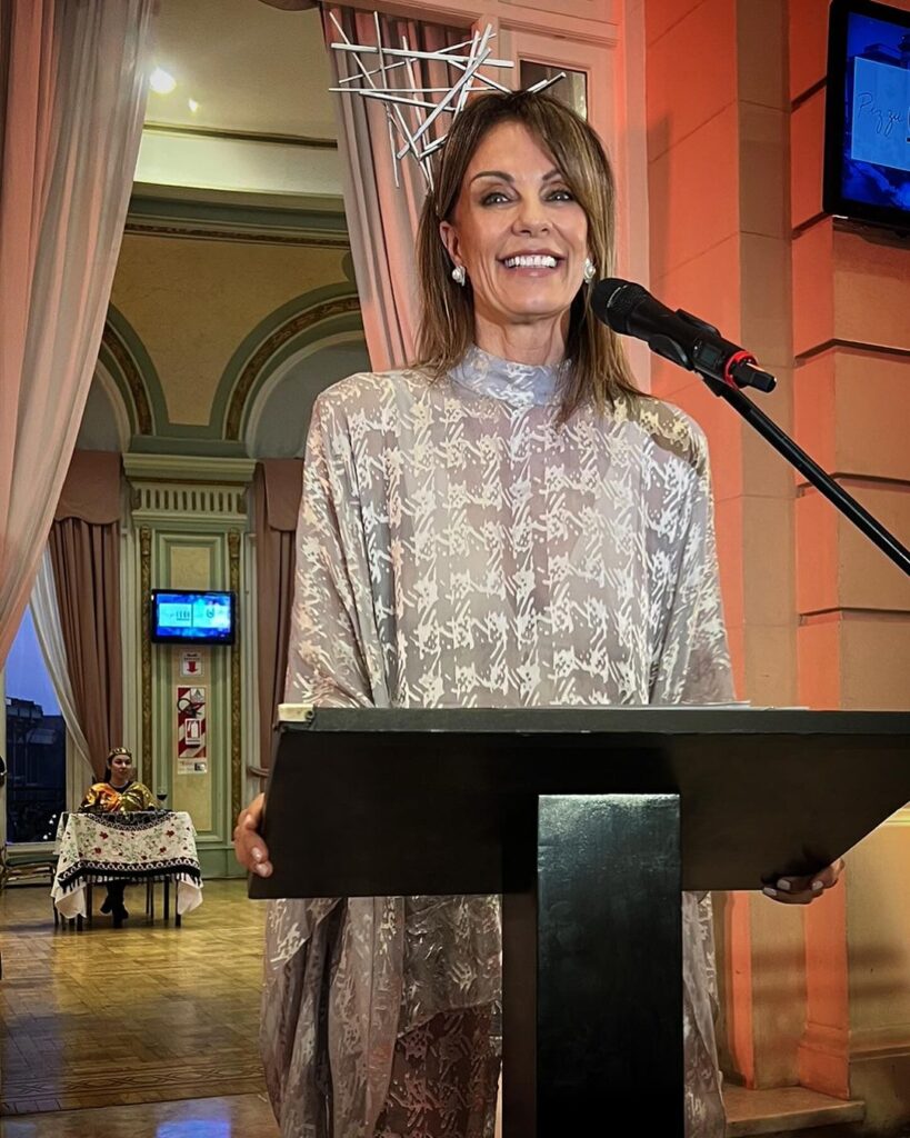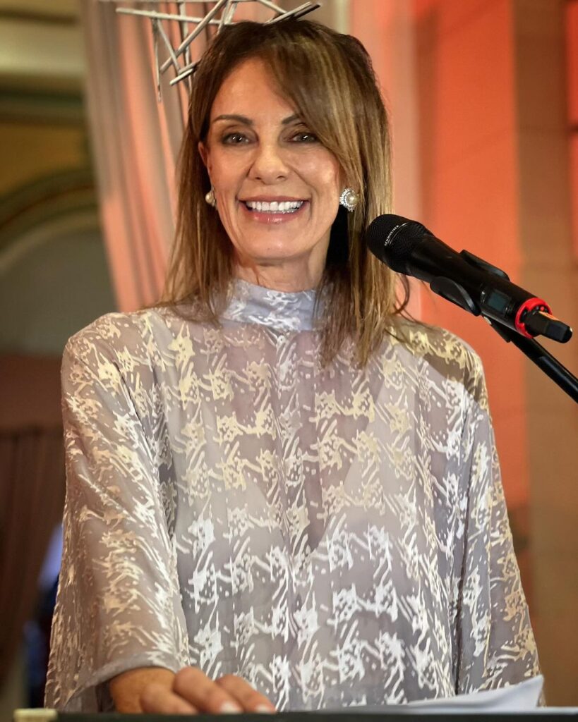 Para conducir la gala benéfica, Nequi Galotti llevó un conjunto de pantalón palazzo y túnica de Adrián Brown, confeccionado en seda de color gris perlado con delicada estampa en blanco y sutiles transparencias.