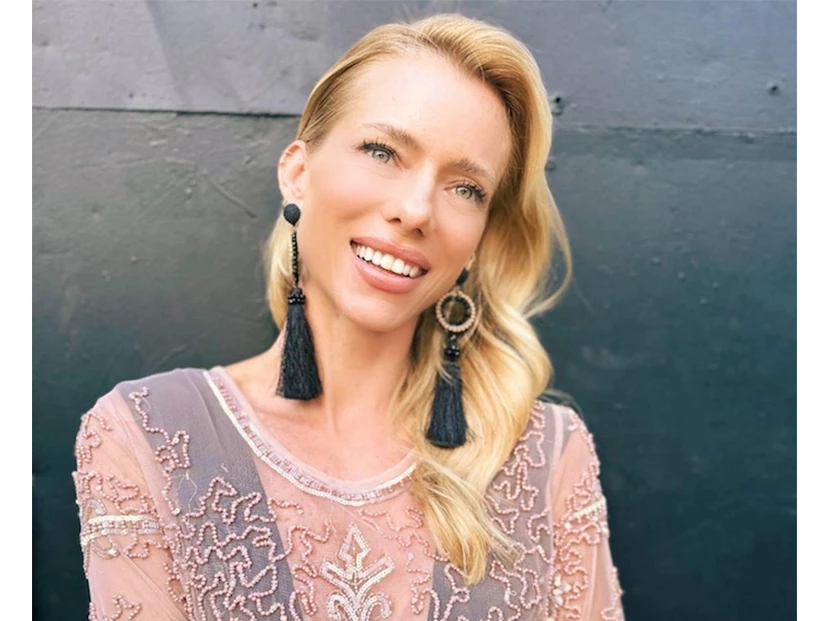 Nicole siguió con el estilo boho chic en su cuarto look, una túnica de gasa bordada con pailettes dorados, acordonada en la zona del escote.
