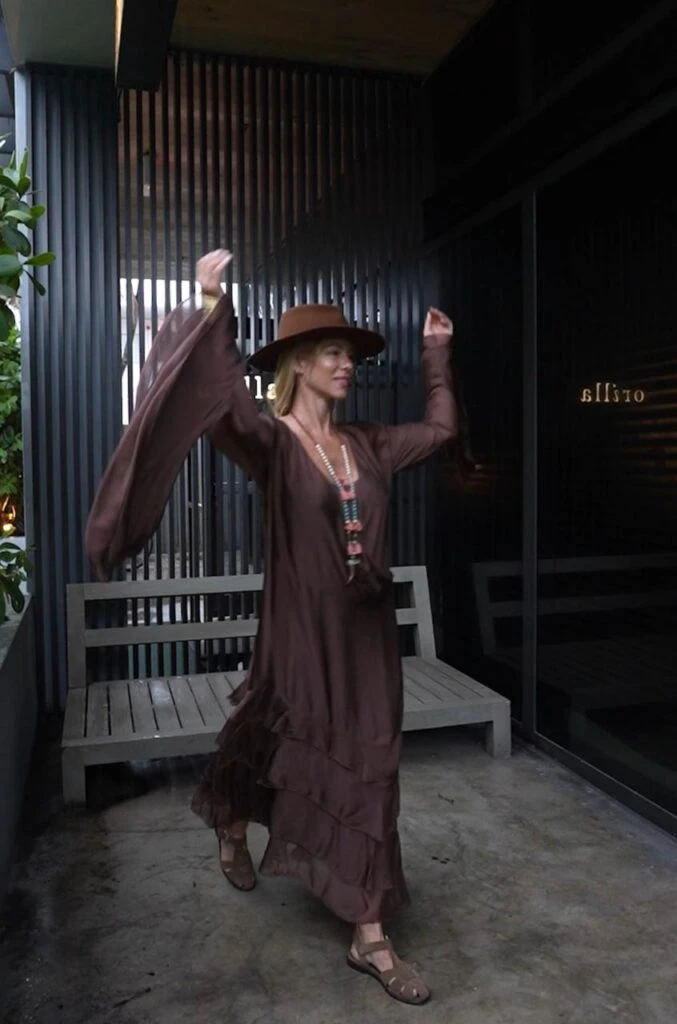 Desde Miami, Nicole Neumann volvió a marcar tendencia con un look que respira frescura, elegancia y sofisticación. Para asistir a un evento, la modelo eligió una túnica de gasa en color marrón, el tono protagonista de la temporada, con volados en la falda y mangas amplias que aportan movimiento y un aire etéreo.