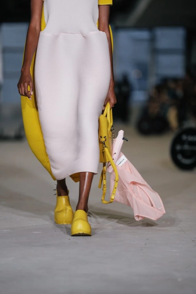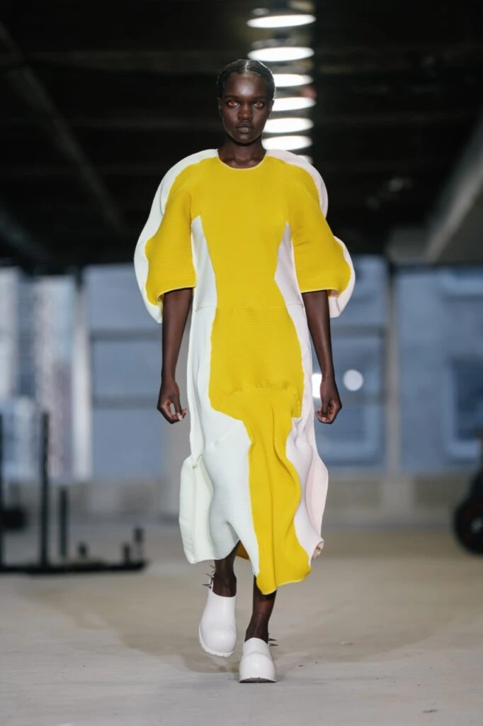 Una de las características más destacadas de la colección fue el plisado ondulado de Baumeister, que agregó fluidez y flexibilidad a las prendas. Esta técnica se mostró en una variedad de colores, incluidos el negro, el rosa, el mostaza y el amarillo, mientras que el uso de espuma agregó estructura a los hombros circulares y las mangas futuristas.