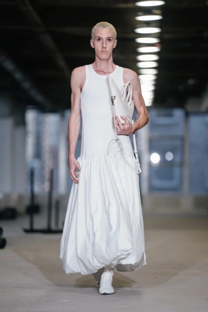 La colección se inspiró en los cuerpos en movimiento, explorando cómo la velocidad puede moldear y transformar tanto el cuerpo como la ropa que se viste. La fascinación de Baumeister por el movimiento ocupó un lugar central y, para enfatizar aún más este tema, invitó a bailarines de ballet contemporáneo a prefaciar el espectáculo con una actuación que reflejara la fluidez y la gracia de sus prendas.