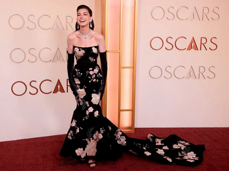 Anne Hathaway fue uno de los ejemplos más destacados con su vestido strapless bordado con flores y una cola espectacular, un diseño que evocaba la riqueza de los tapices de alta costura.