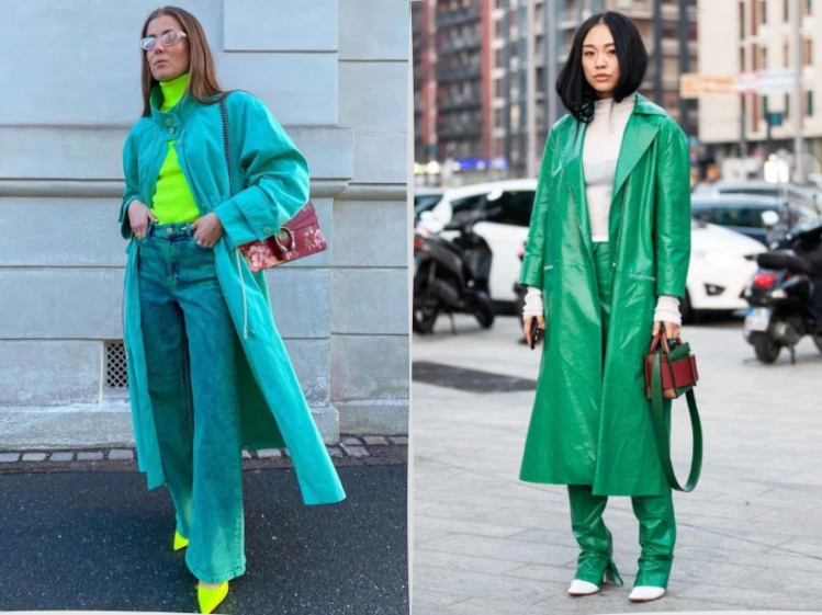 Esta es una de las opciones más jugadas. Suéter verde, pantalón sastrero en el mismo tono, combinado con trench celeste, botas chunky y cartera blanca. Un outfit color block para ponerle un poco de onda a estos días grises.