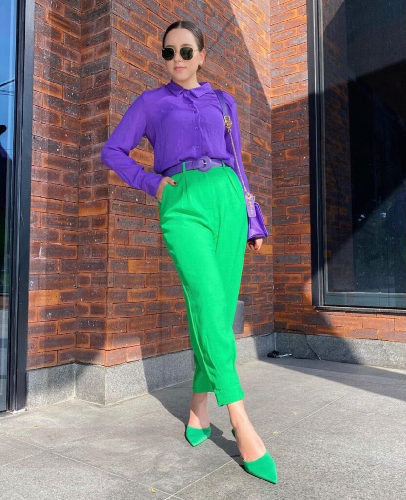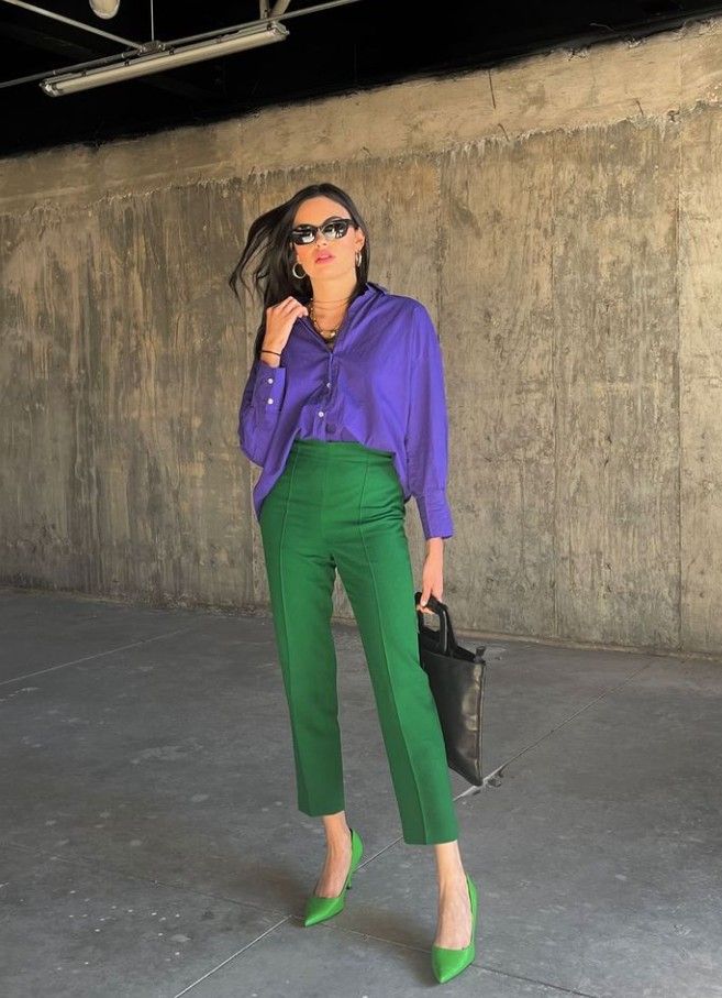 Otra combinación desenfadada y muy trendy. Acá sumás los dos colores de la temporada: verde más violeta. ¿Te animás?