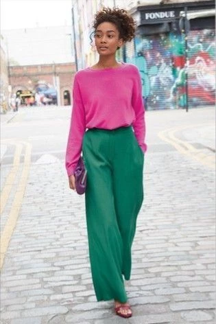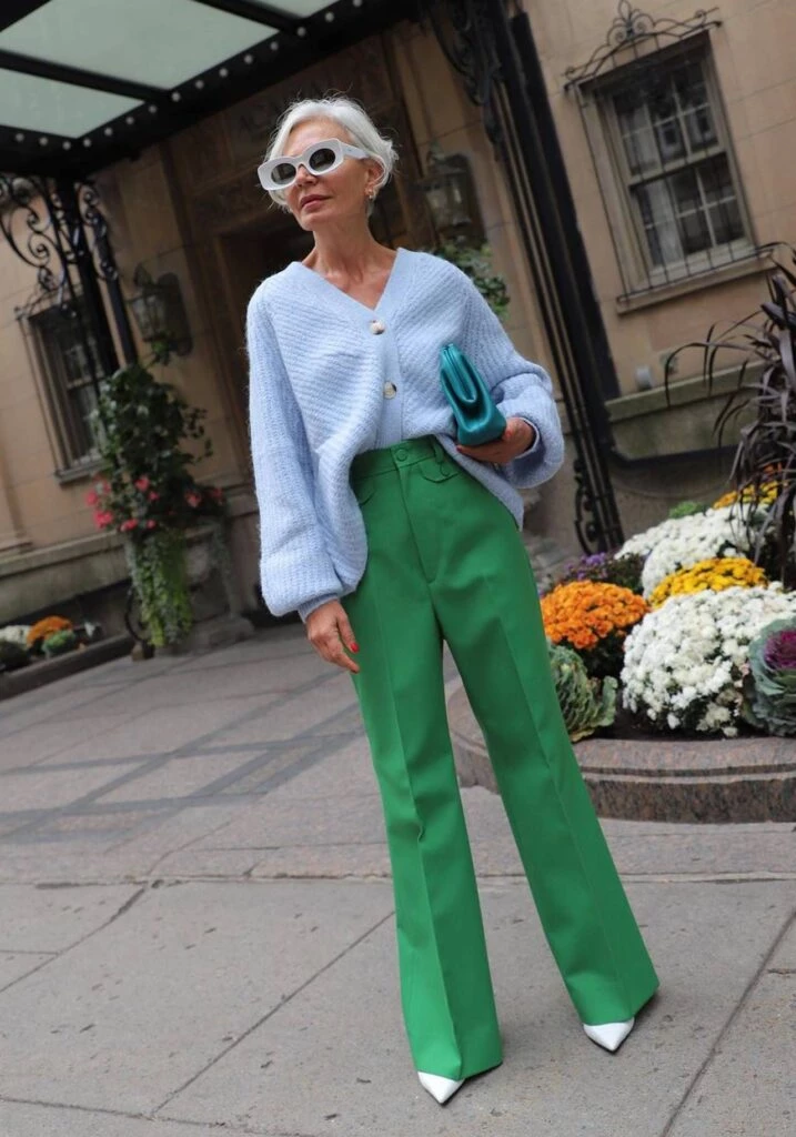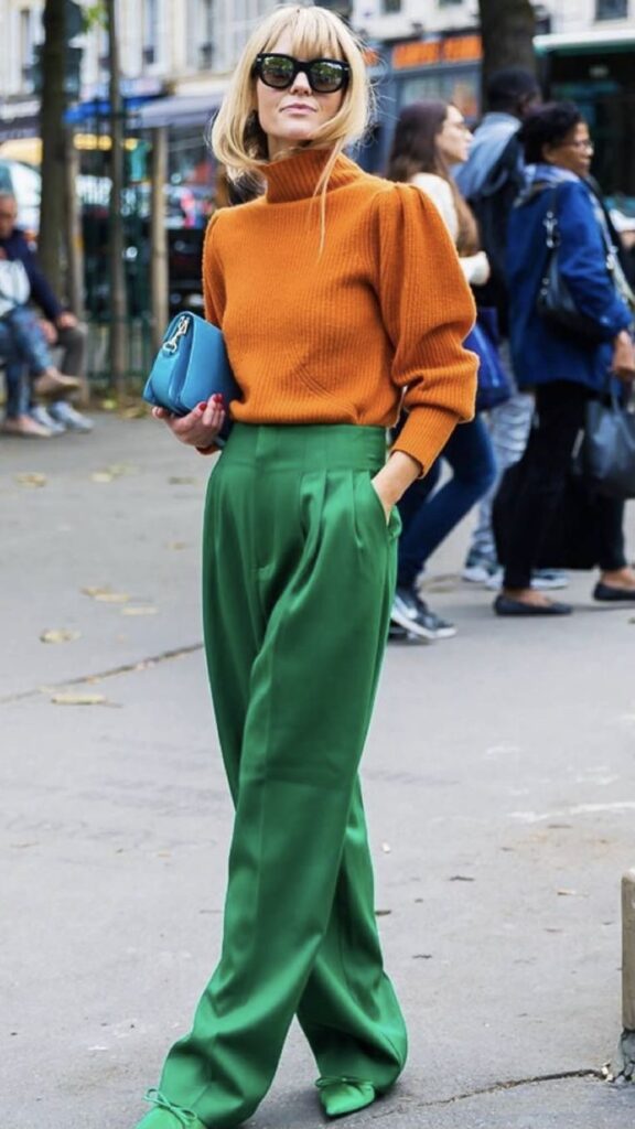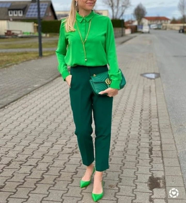 Una alternativa fácil es armar total look, o sea que combines la parte de arriba también en verde al igual que los pantalones.