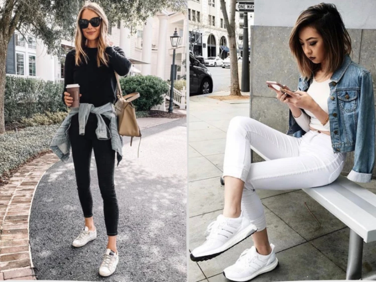 Suéter oversize blanco, jean shupín negro y zapatillas blancas. Un outfit black and white que nos deja ver que el combo chupín y zapatillas se adapta a todos los estilos, desde los más clásicos como el que vemos en la foto hasta los más trendy.