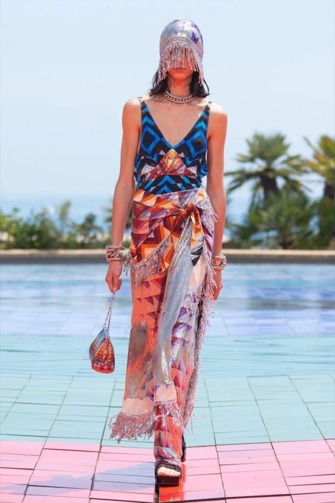En el desfile se destacaron prendas de malla metálica característica de Dossena, estampados de girasol de los años 70, tejidos de macramé y, también, más estampados de caleidoscopio.