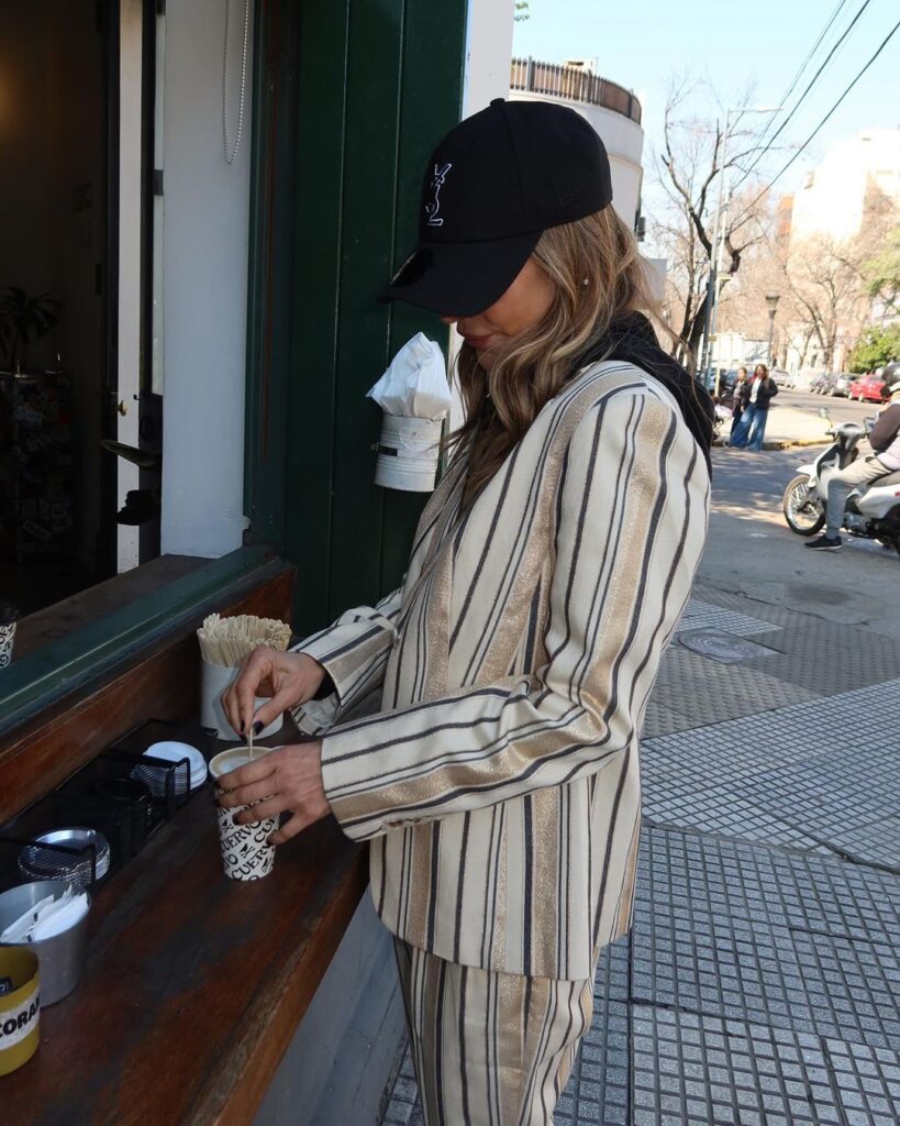 El look de María se adapta a una ocasión casual: el conjunto tiene estampa a rayas, en colores blanco, crema y negro. En ese color se sumó un suéter, que brinda contraste y personalidad.
